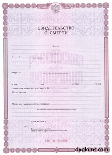 Обращайтесь! На нашем сайте Вы сможете в короткие сроки получить свидетельство о смерти, для этого нужно лишь оформить онлайн-заказ, проконсультировавшись при необходимости с нашими специалистами. Свидетельство будет подготовлено на бумаге соответствующего качества со всеми необходимыми подписями и печатями.